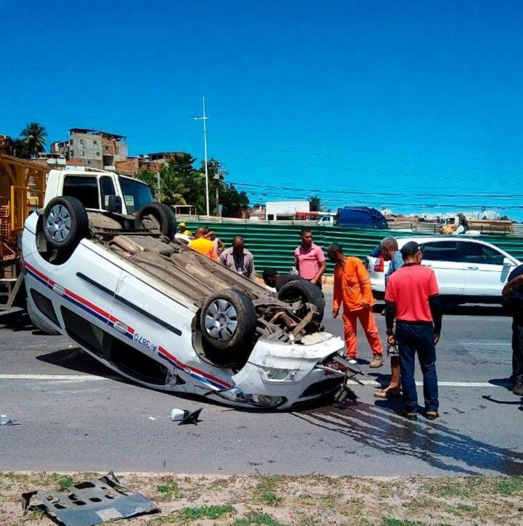 Um táxi capotou, no fim da manhã desta quinta-feira, 31, na avenida Paralela, sentido rodoviária. O acidente aconteceu na altura do Rei da Pamonha.